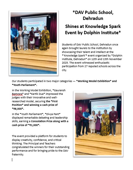 Students of DAV Public School, Dehradun once again brought laurels to the institution by showcasing their talent and intellect at the *‘Knowledge Spark’* event organized by *Dolphin Institute, Dehradun* on 12th and 13th November 2025. The event witnessed enthusiastic participation from 27 reputed schools across the city.
